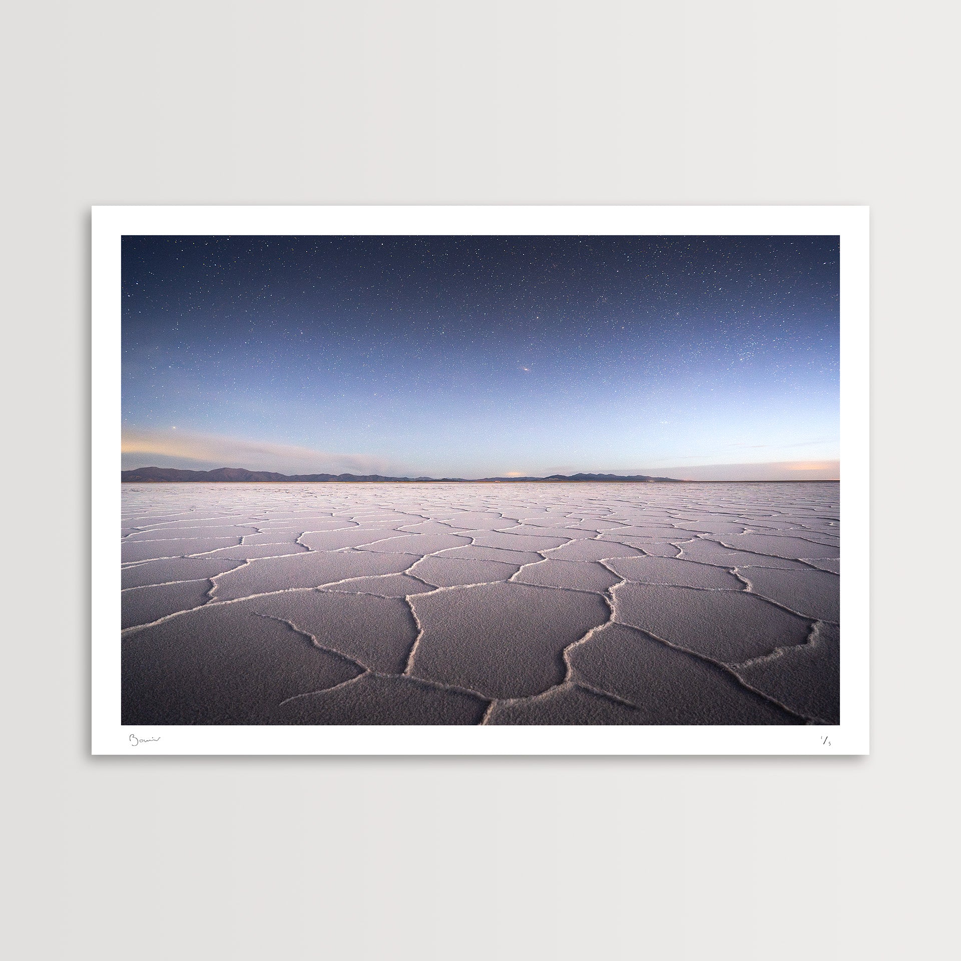 Salinas Grandes is the name of a salt flat in the provinces of Jujuy and Salta in the Argentine Northwest. Its origin dates back to a long period between 5 and 10 million years ago. In the sky, the Andromeda Galaxy stands out among the stars.