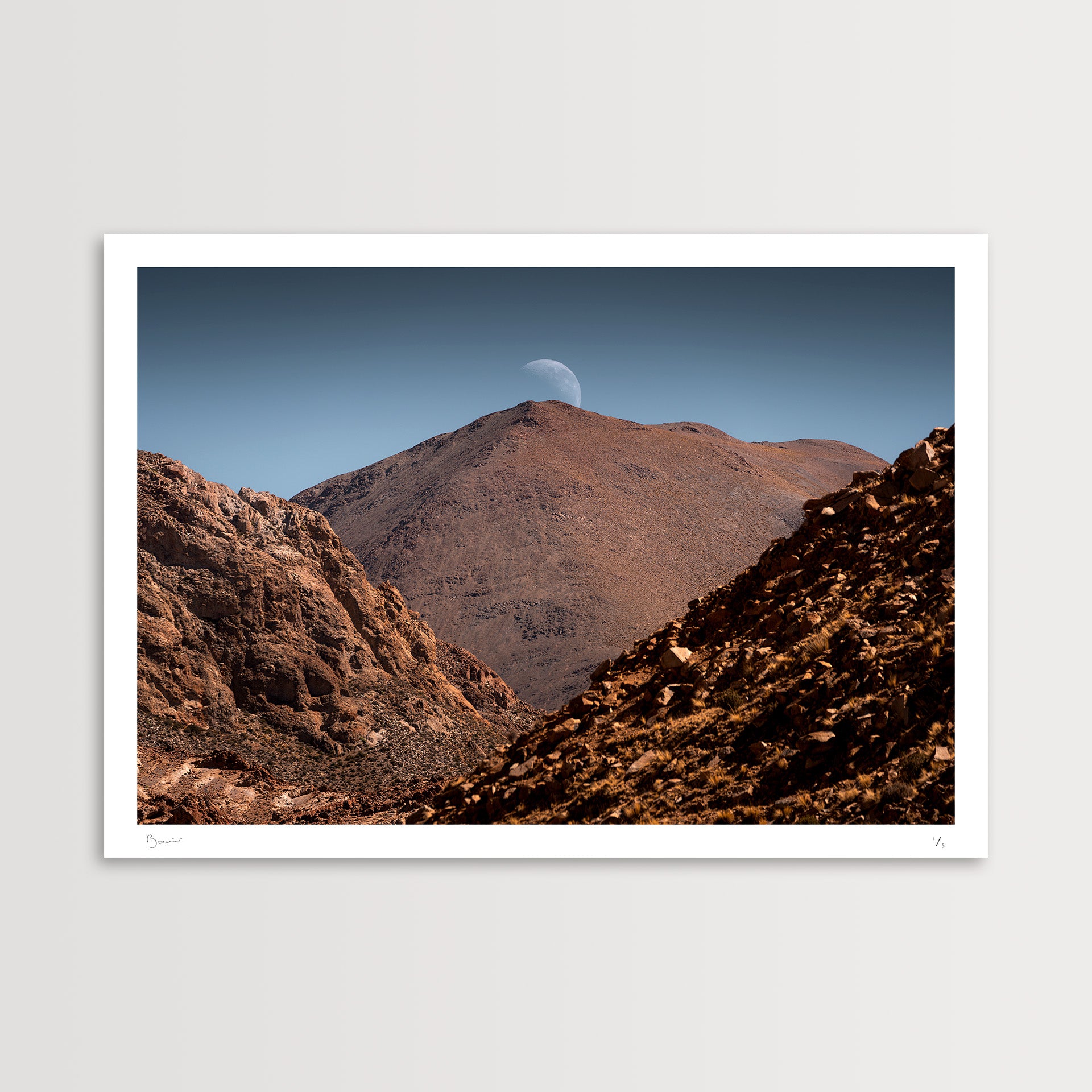 - This piece is available in three sizes: small 30x42cm (A3), medium 42x59cm (A2) and large 59x84cm (A1), in editions of 10, 5 and 5 prints respectively—only 20 prints in total—, with the option to purchase just the print (including a border for easy framing) or already framed.
